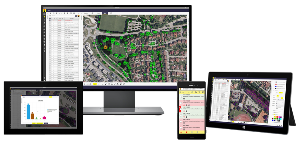Aufeinander abgestimmte Softwarekomponenten unterstützen Sie ab sofort bei der Baumdatenerfassung, der Baumkontrolle und dem Maßnahmenmanagement der Baumpflege.
